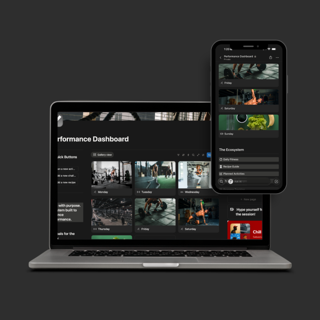 A complete 9-week performance system developed from scientific training principles and real competitive athletic experience. Delivered through a fully integrated Notion Performance Dashboard, our Blueprint delivers a professionally structured training framework designed to build real functional strength, movement quality, and performance capacity.
